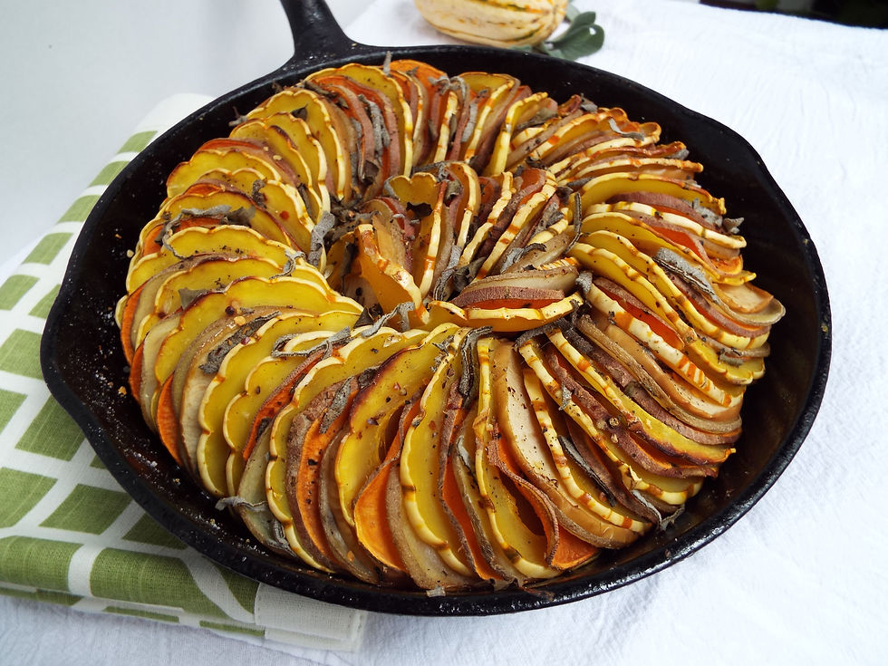 Starting at the outer edge of your skillet, begin arranging the Delicata and potatoes in an alternating pinwheel pattern. Place the apples after every third or fourth repetition of squash and potatoes. Repeat until the skillet is packed tightly and filled to the center.