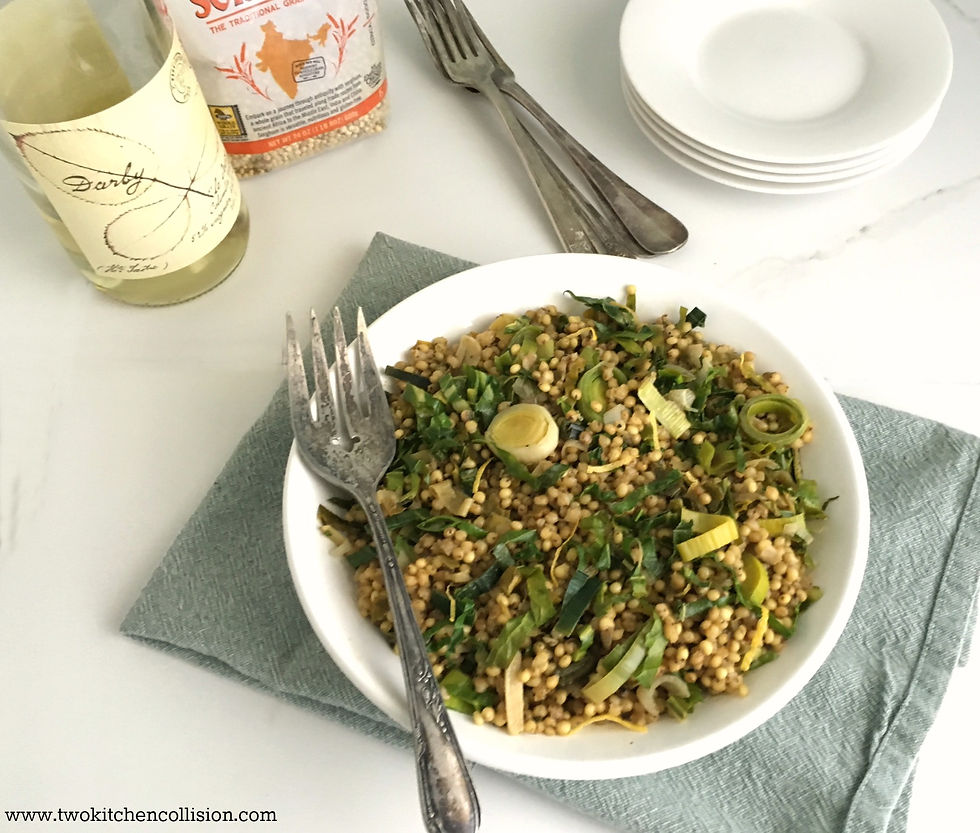 5. Strain the sorghum and place it, over medium heat, into the pan your leeks cooked. Add 1 cup of the broth/wine mixture and cook, stirring constantly until the liquid is almost evaporated. Add another cup of the mixture and repeat. Continue this process until the sorghum has only a small amount of "bite" left. Sorghum is a chewy grain and will remain a bit toothsome.